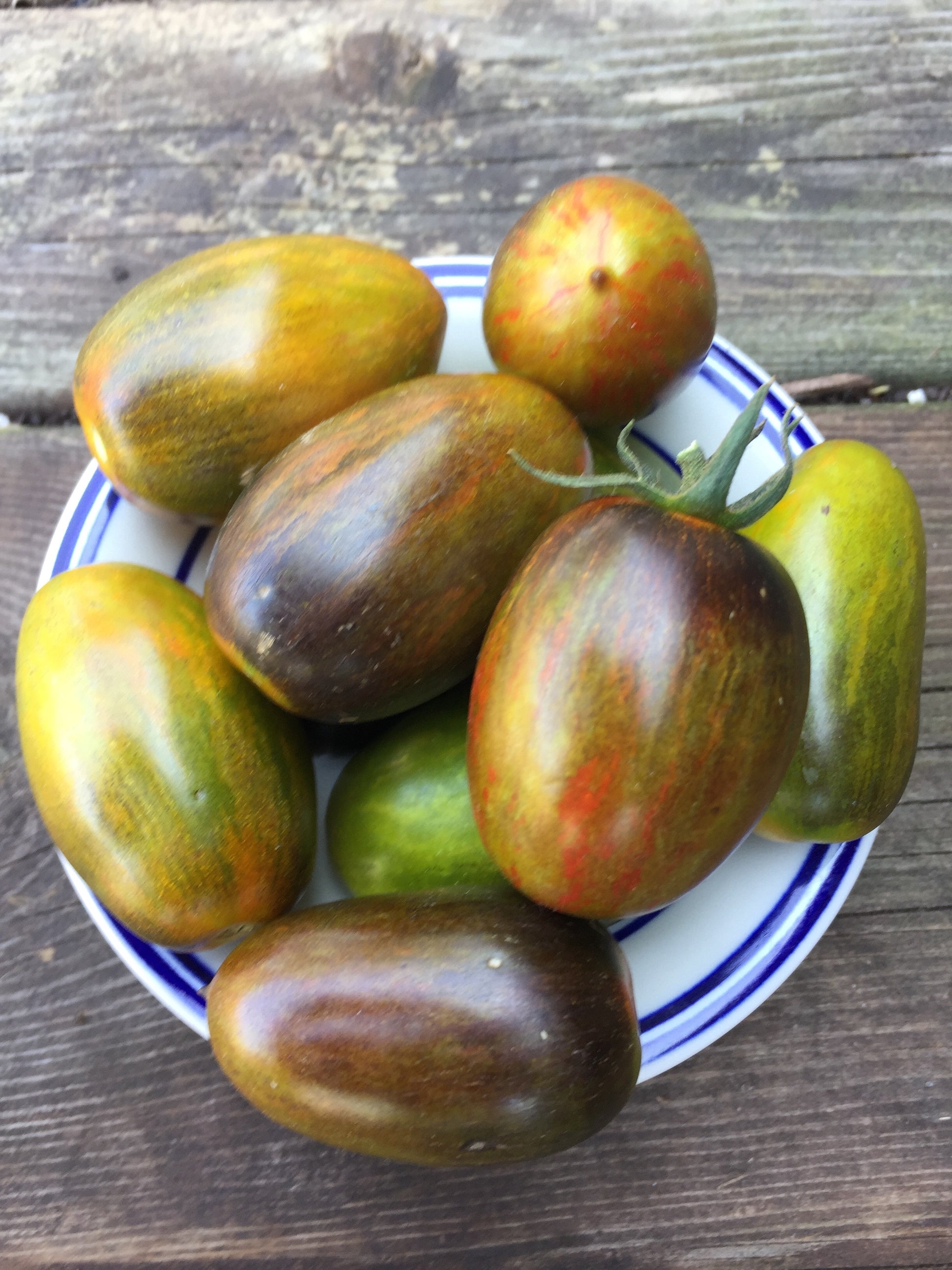 One of our favourite Brad Gates varieties, these multi-coloured, elongated cherry tomatoes are delightfully balanced between sweet and citrus and visually striking. They are a lot of fun to grow and watch ripen from deep purple/black and lime green to the galaxy-like range of colours. They tend to keep well and they're great for mixed pints! 70-85 days to maturity.