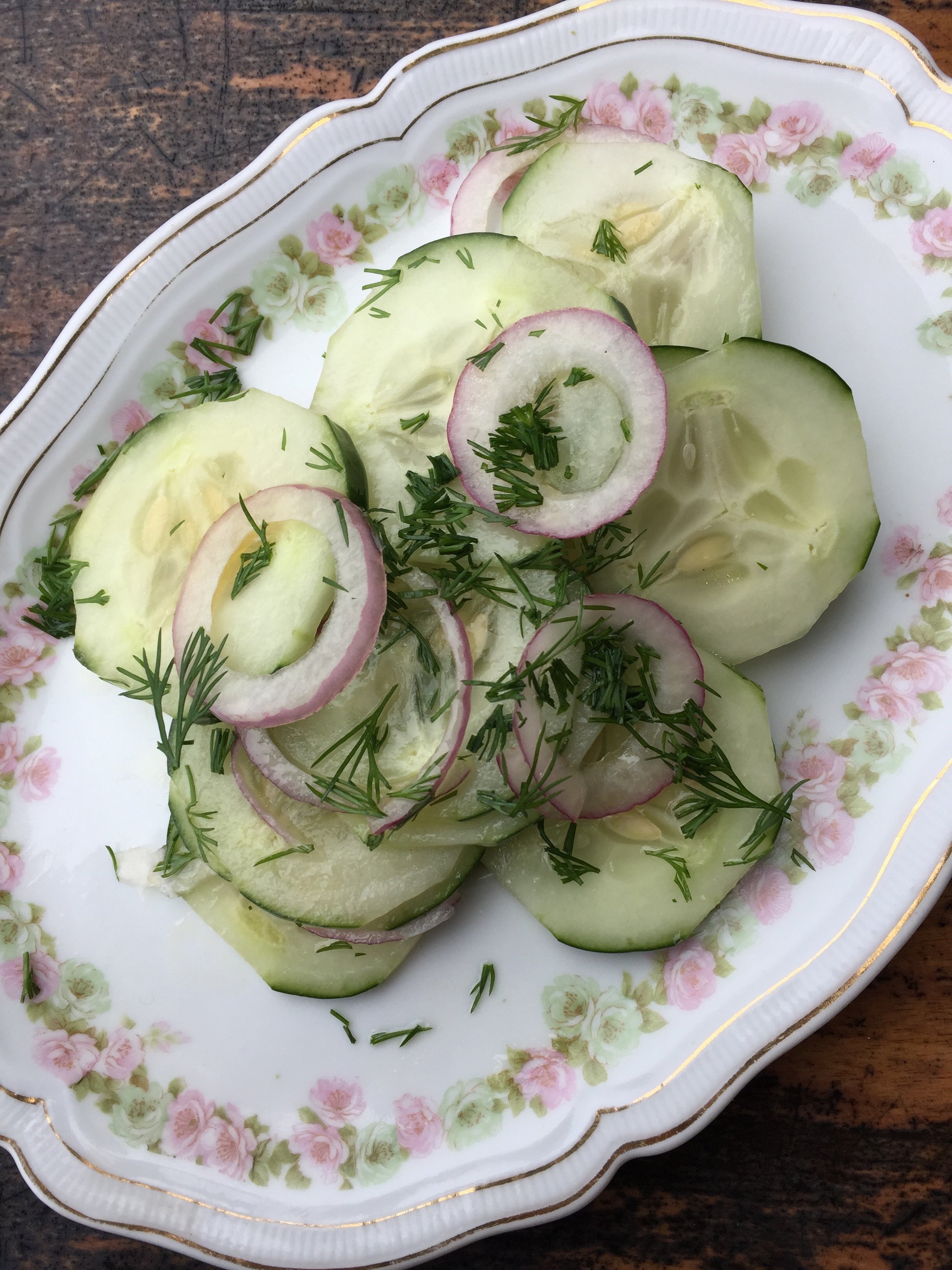 Toss cucumber slices, along with thinly sliced red onion (Rossa di Milano is great for this) in olive oil, apple cider vinegar, salt and a pinch of sugar. Let the mixture marinate for 10-15 minutes before serving. Add finely chopped herbs if you like, or even serve with a yogurt based creamy dressing. Simple, fast and refreshing.